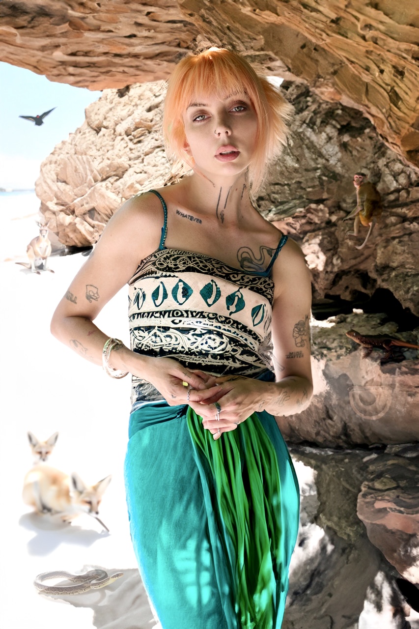 Digital Poster presenting Kimberley Tribal Fashion in Australia;  AI-enriched for storytelling;  featuring model Shay Peyote