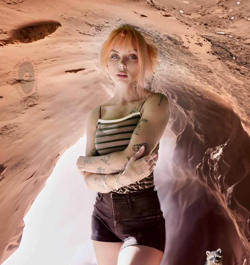 Digital Poster presenting Red Dust Tribal Fashion in wilderness;  AI-enriched for storytelling;  featuring Australian model Shay Peyote