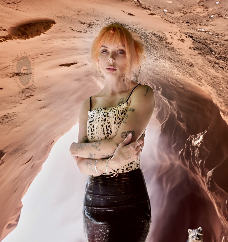 Digital Poster presenting Red Dust Tribal Fashion in wilderness;  AI-enriched for storytelling;  featuring Australian model Shay Peyote