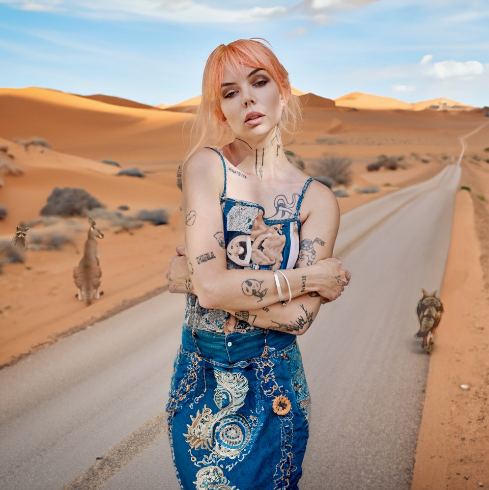 Digital poster presenting Red Dust Tribal Fashion in Australia’s wild Kimberley; Â AI-enriched for storytelling; Â featuring model Shay Peyote