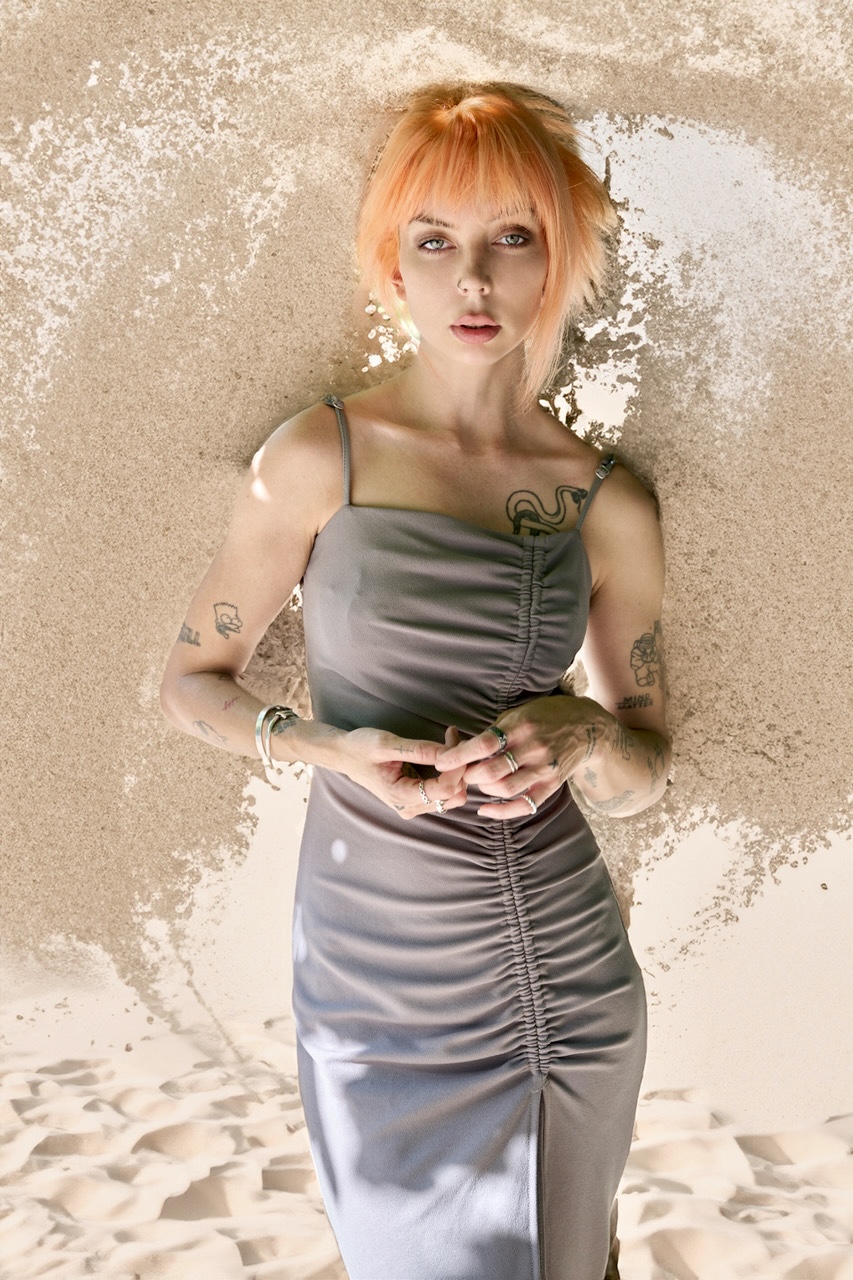 Digital poster presenting Australian model Shay Peyote in sandy environment; Â AI-enriched for storytelling